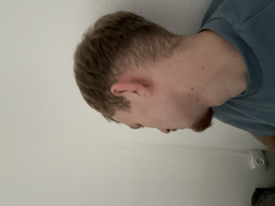 The image depicts an adult male from the left profile, occupying the right half of the frame. He has light brown hair, styled with a fade, and a short reddish-brown goatee. He is wearing a plain light blue crew-neck shirt or sweatshirt. His head is turned to the left, and his right ear is fully visible. The man appears to be looking towards the left side of the frame. The background consists of a plain, light-colored, possibly off-white, textured wall. In the lower-left quadrant of the image, a white European-style electrical outlet with two circular sockets and an earth pin recess is mounted on the wall. A dark, indistinct object is partially visible in the bottom-left corner, beneath the outlet. No visual elements in the image identify the specific location as Strasbourg, France. The scene is indoors.