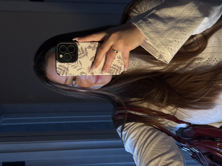 A single female individual is depicted in a mirror selfie taken indoors in Tlustenkhabl, Russia. The subject, positioned center-frame, has long, dark brown hair with lighter highlights and a visible light-colored left eye. She wears a white long-sleeved top featuring a textured, eyelet, or broderie anglaise pattern. A glossy dark red shoulder bag with silver hardware is visible on her left side. Her right hand, with manicured nails displaying a light polish, holds a smartphone vertically, obscuring the right side of her face. The phone case is light-colored with vertical stripes and a pattern of stylized botanical elements in muted tones. A gold-toned ring with a central silver band is worn on the ring finger of her right hand. The smartphone appears to be an iPhone model with a prominent triple-camera array. The background is dimly lit and indistinct, with vertical dark and light stripes visible on the left, possibly indicating blinds or a door frame. The subject's expression suggests a slight smile.