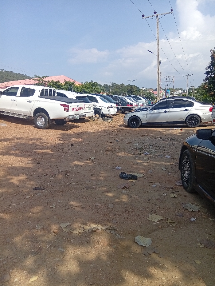 The image displays an unpaved outdoor parking area located in Lokoja, Nigeria, under bright daylight with a clear sky