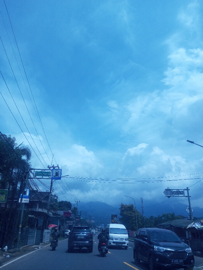 This image depicts a street scene in the city of Chori, Nigeria, under a bright, partly cloudy blue sky, with dark mountainous terrain visible in the distant background. The foreground shows an asphalt road, appearing to have at least two lanes of traffic. On the left side of the road, a dark-colored SUV is observed, its rear license plate partially visible. Ahead of the SUV, a person on a motorcycle is driving while holding a red umbrella. Further down the left lane, a white passenger van is visible, followed by another motorcycle. In the right lane, a dark minivan is present, also with its rear license plate partially visible. The left side of the road is bordered by a series of low-rise buildings with various roof types, interspersed with green trees and dense foliage. Multiple utility poles line this side of the street, supporting numerous power lines that crisscross the upper left portion of the frame. A prominent blue street sign, attached to one of the utility poles, features white text and a gas pump icon. On the right side of the road, less defined structures, possibly vendor stalls or small shops, are partially obscured by trees and the passing minivan. The scene captures an active urban or semi-urban environment during daylight hours.