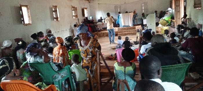 The image displays an indoor gathering of approximately 50-70 individuals, including adults and children, within a simple, light-walled building in Konongo, Democratic Republic of the Congo