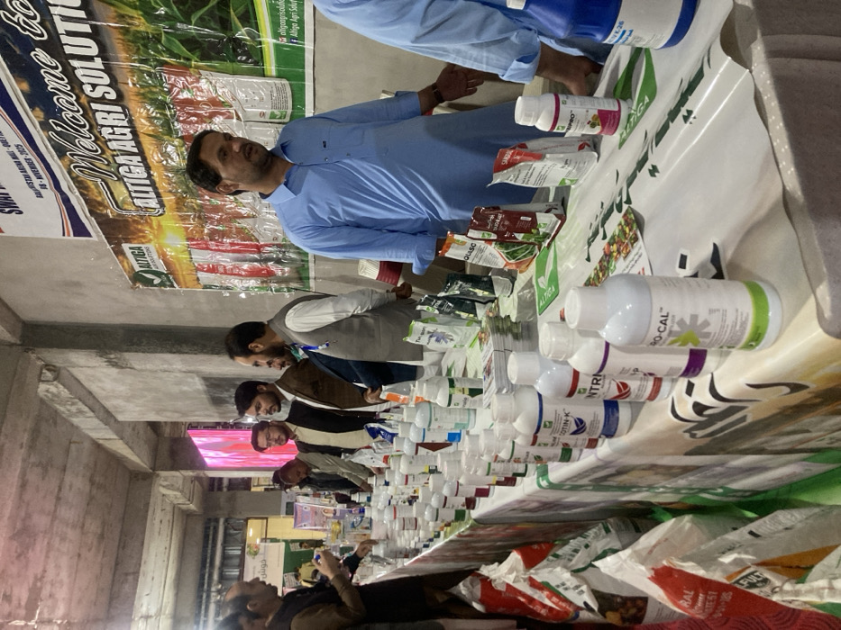 An indoor agricultural exhibition booth is depicted at the Baluchistan ARID MALL in Quetta City Tehsil, Pakistan, dated November 8, 2023