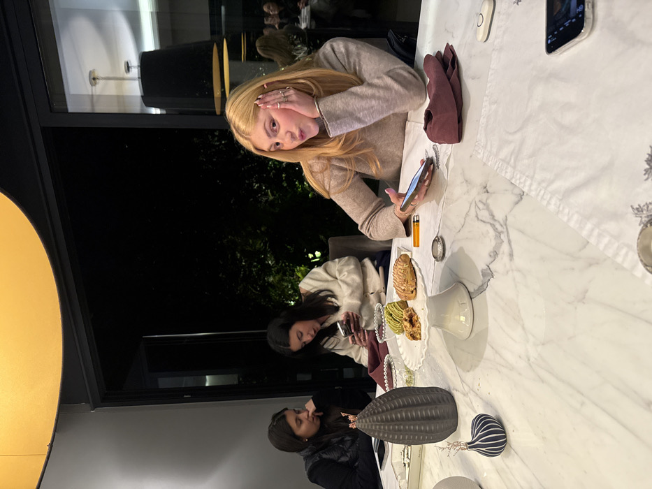 A woman with blonde hair is seated at a table, holding a phone and touching her face. The table, which is white marble, also has desserts on a cake stand, a lighter, a tea strainer, and a dark purple cloth. Two other women are visible at the same table, one in a white sweater and the other in a black jacket. A large lamp is visible in the left side. Outside, it is dark.