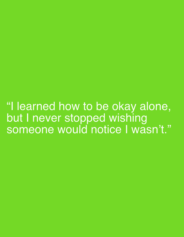 The image displays white text centered against a solid, vibrant green background. The text, enclosed in quotation marks, reads: "I learned how to be okay alone, but I never stopped wishing someone would notice I wasn’t." No people, objects other than the text, actions, interactions, or discernible environmental features related to a specific city or location are depicted.