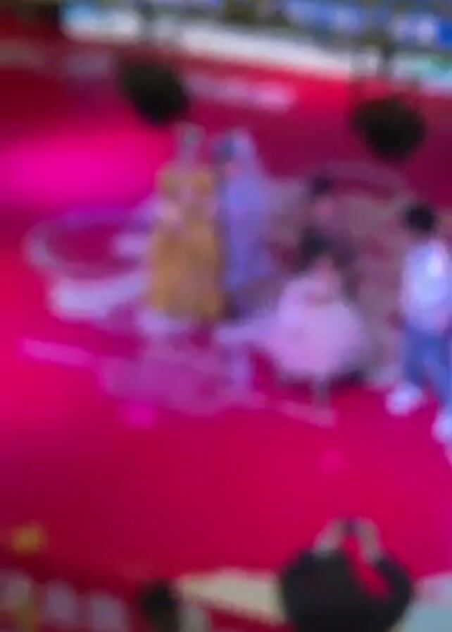 Several children stand on a red stage. The stage is labeled "HAPPY CHINESE NEW YEAR 2026 WANDA PLAZA." The children wear fancy clothes and stand in a group. People stand at the foot of the stage, taking photos and watching the children. A large blue sign stands in the background, displaying writing in a non-English language. The scene occurs indoors.