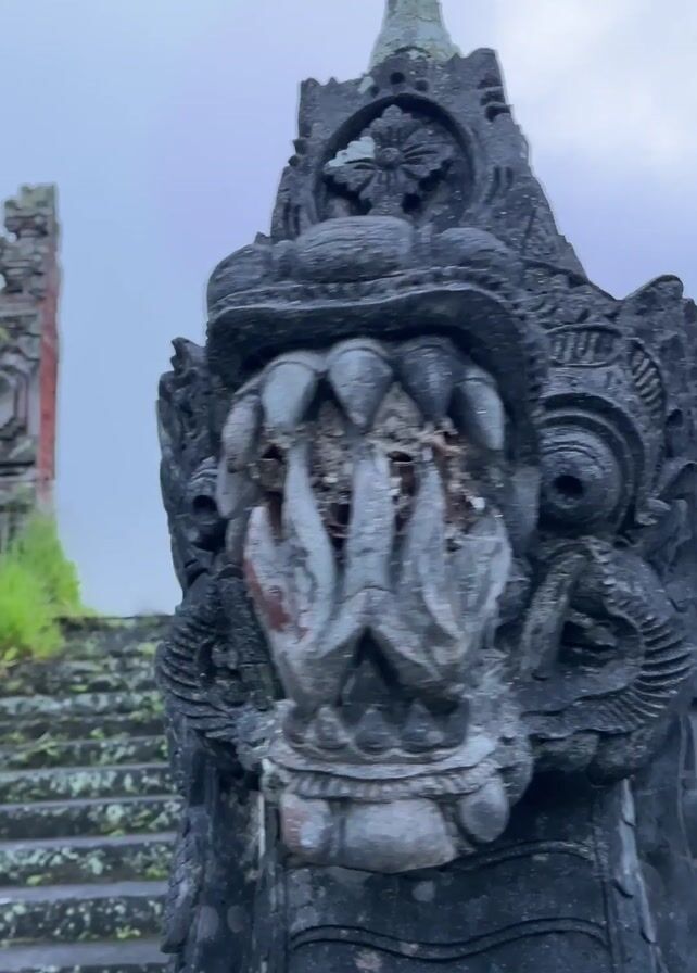 - "The camera pans up the overgrown steps of an old stone temple, moving from a close-up of a carved stone dragon's head with an open mouth and worn teeth to the moss-covered stone steps leading up to a weathered, decorative archway" by FM-RL7Aj1, licensed under CC BY 4.0