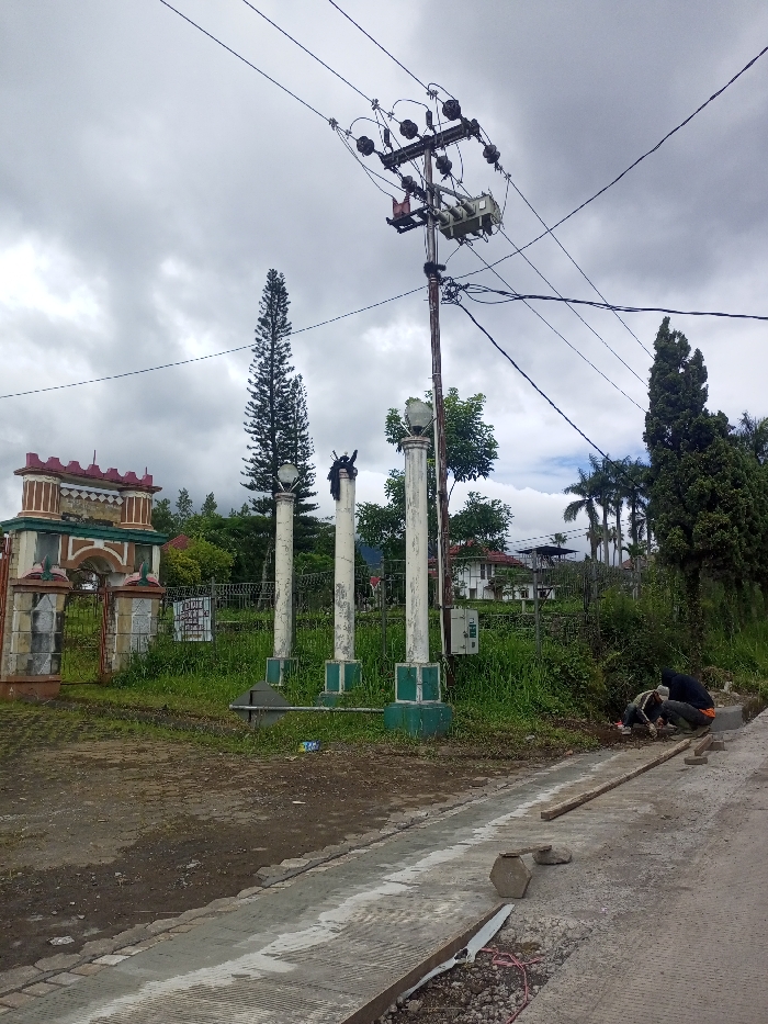 A cloudy day illuminates a scene featuring a weathered gate with red and brown accents, three white pillars topped with spherical lights, and a tall evergreen tree. An electrical pole with transformers and tangled wires dominates the skyline. Two workers labor on a road construction project in the foreground. Overgrown grass surrounds the pillars and gate, leading to a fence and a white building in the distance.
