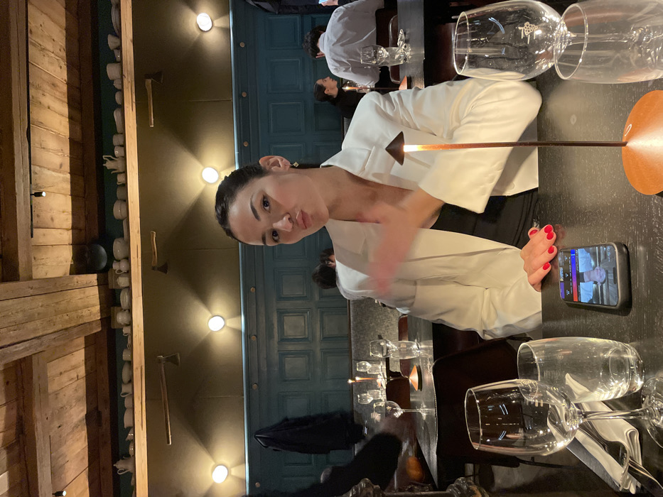 A woman in a white blazer sits at a restaurant table, posing for a photo. She puckers her lips and extends one hand. A smartphone displays a video. Wine glasses and a unique lighting fixture featuring an arrow design are on the table. The restaurant's decor includes wooden walls adorned with axes and porcelain objects. Other patrons are visible in the background.