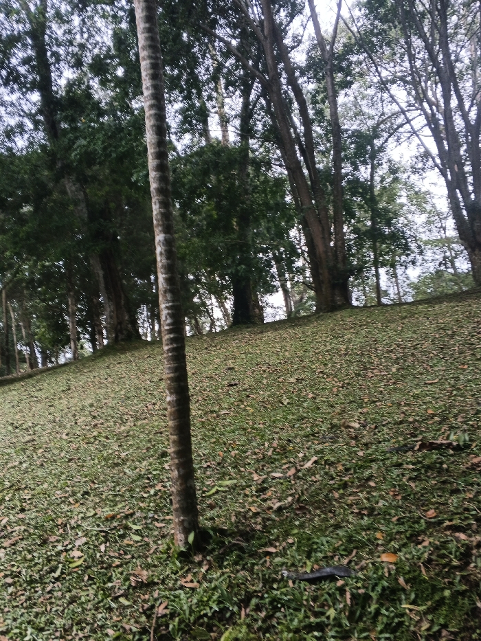 The image displays an outdoor scene depicting a gently sloping, grass-covered hill leading into a dense forested area. In the foreground, a single, slender tree trunk with a light brown, ridged bark pattern stands vertically on the left side of the frame, originating from the lower-left. Its base is surrounded by short, vibrant green grass. To the right of this trunk, on the grassy slope, a dark, elongated, irregular object, appearing to be debris such as a piece of rubber or plastic, is partially obscured by the grass and scattered fallen leaves. The midground is dominated by the upward-sloping terrain, covered predominantly in short green grass. This grass is interspersed with numerous fallen leaves in shades of brown, yellow, and darker green, distributed across the entire slope. The incline rises towards the background, meeting the tree line. The background consists of a dense collection of tall, mature trees with varying trunk thicknesses and foliage densities. The canopies are primarily green, with some areas showing bare branches against a bright, overcast or diffused sky, which is largely obscured by the tree cover. The lighting is soft and diffused, indicating an overcast sky or a time of day with indirect sunlight. No human figures or animal life are visible. The scene depicts a natural, likely park-like or woodland environment. The precise location within Lalitpur, Nepal, cannot be determined from the visual evidence alone, beyond identifying it as a forested or green space within the city.