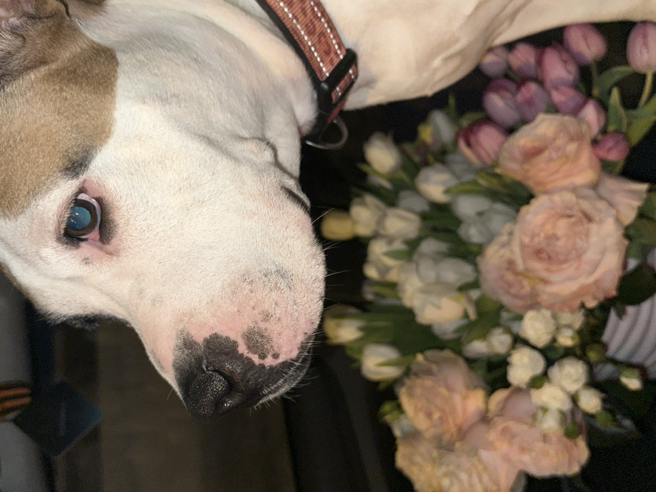 - "A close-up, eye-level indoor shot captures the left profile of a dog with predominantly white fur and light tan markings on its head, situated in the city of Базарово, Russia" by FM-2t2Dl2, licensed under CC BY 4.0