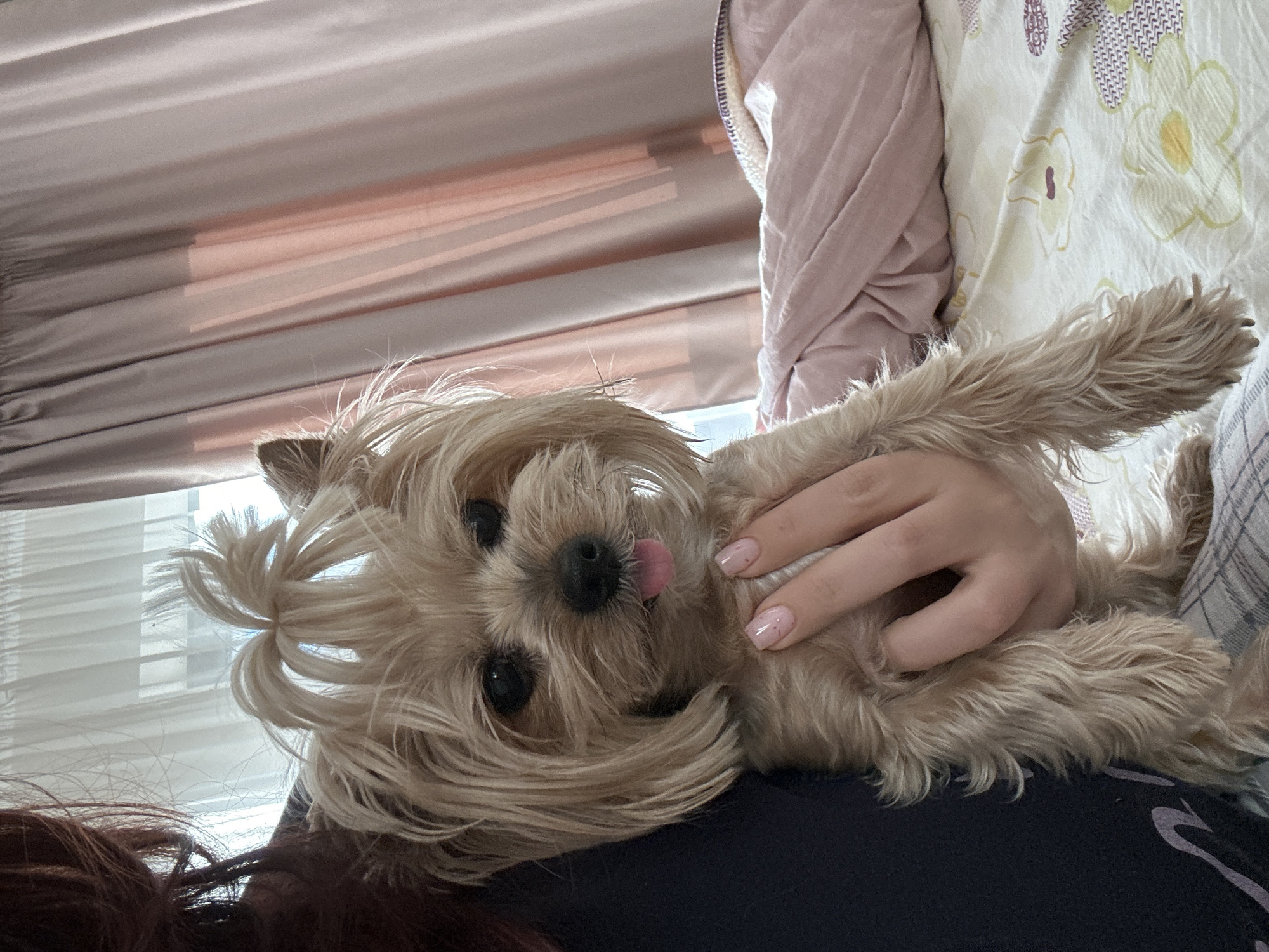 A medium shot depicts a small, light brown dog lying on its back, held by a person whose hand is visible. The dog has long hair styled in a small ponytail on top of its head. It is sticking its tongue out, seemingly in a playful manner. The person holding the dog has fair skin and manicured nails. They are wearing a black t-shirt. The background includes a pink curtain, a white floral patterned sheet, and a pink sweater. The location is not discernible from the image, so it is not possible to determine if it is in Sofia, Bulgaria.