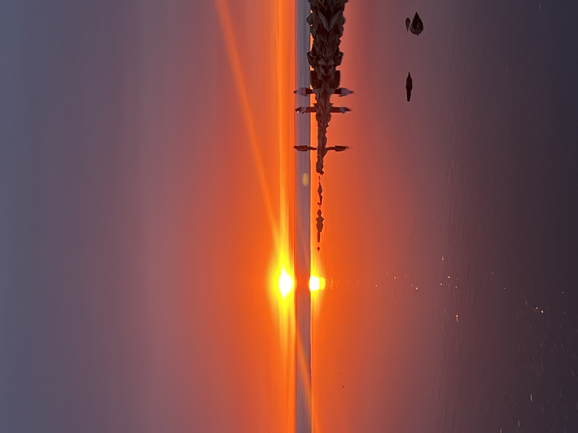 n inverted view of a sunset scene in Sestroretsk, Russia. A pier or dock extends out into the water, reflected in the glassy surface. The sun is low on the horizon, creating a bright orange glow and strong reflections. The sky transitions from orange near the horizon to purple further up. Scattered objects, possibly debris, float in the water to the right.