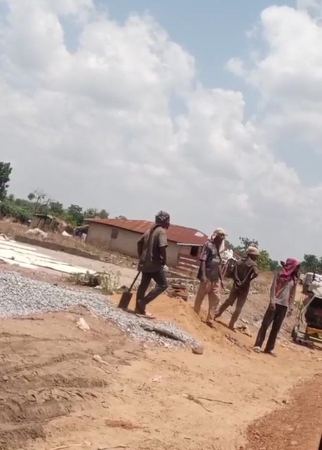 group of four men walking along a dirt road in what appears to be a rural area. The men are wearing casual clothing, and some have head coverings. One man is carrying a shovel. Beside the road there's a pile of gravel and some construction materials. In the background, there are simple buildings and trees, under a sky with scattered clouds.