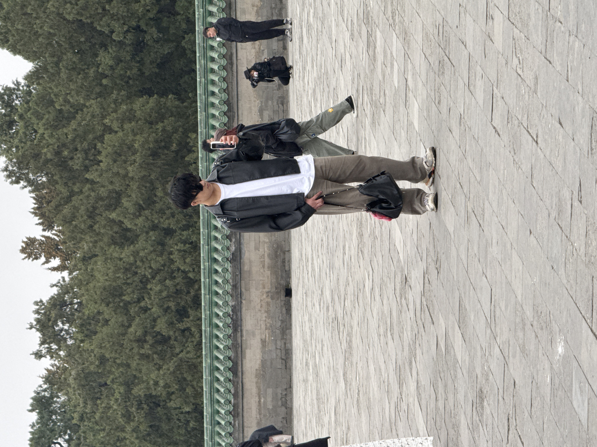 A wide-angle, eye-level photograph depicts a public plaza scene within the Temple of Heaven complex in Dongcheng District, Beijing, China, under an overcast sky. The foreground features a large expanse of grey rectangular stone paving. A low stone wall with a distinctive green tiled coping runs horizontally across the middle ground. Behind this wall, a dense line of dark green coniferous trees forms a natural backdrop, extending towards the light grey sky. The primary subject, an East Asian male, stands slightly left of center in the mid-foreground. He wears dark sunglasses, a black short-sleeved jacket over a white t-shirt, loose-fitting khaki pants, and white athletic shoes. He holds a black shoulder bag with a red accent in his left hand, which hangs by his side. In his right hand, he holds a white smartphone vertically, pointed away from the viewer, consistent with taking a photograph or video. Several other individuals are present in the background. To the right of the main subject, another East Asian male, wearing a black jacket and a brown cap, walks and holds a white smartphone horizontally. Further to the right and slightly behind, an East Asian individual wearing a black wide-brimmed hat, black jacket, and black pants is crouched down, holding a professional camera with a lens pointed forward; a black bag rests near their position on the ground. To the far right, an East Asian male in a black hooded sweatshirt and black pants stands with his hands clasped. A portion of a fifth individual, wearing a white patterned garment, is visible on the far left edge of the frame.