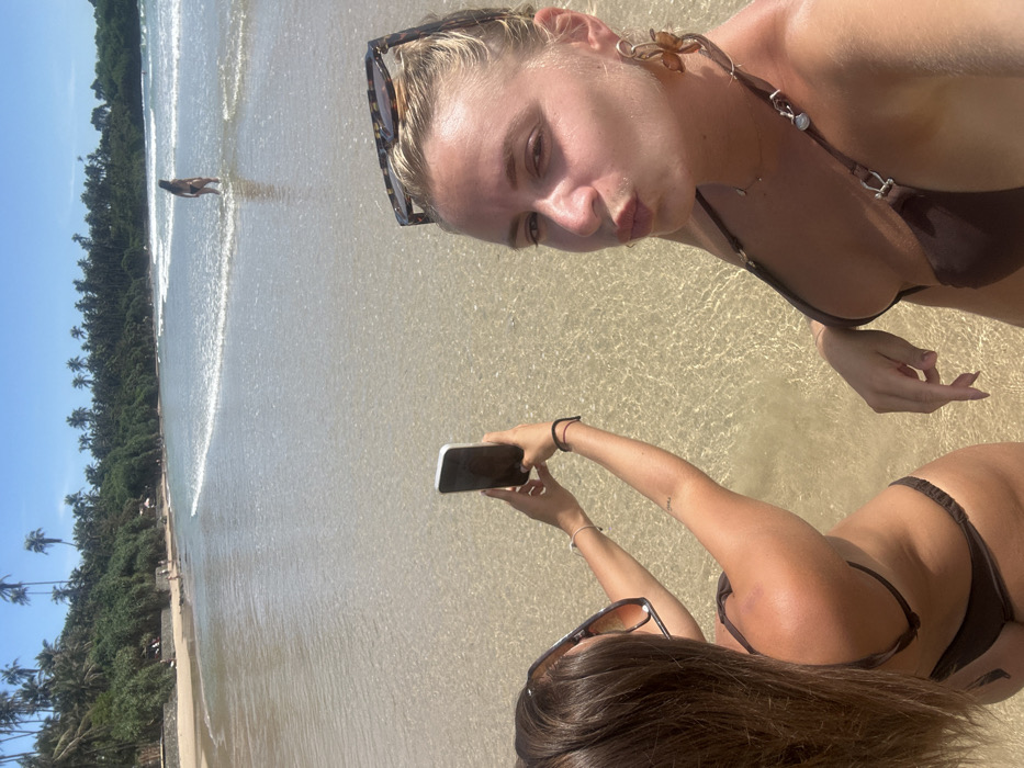 Two women in brown bikinis are taking a selfie on a beach with clear, shallow water. The woman in the foreground is holding a phone, while the other woman is in the background making a kissing face. The coastline is lined with lush greenery, and another person is visible wading in the water. One woman is wearing sunglasses on her head, and the other is wearing sunglasses on her face.