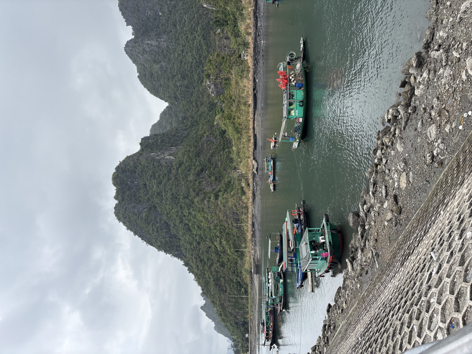 The image depicts a harbor scene in Ha Tu Ward, Vietnam, under an overcast sky