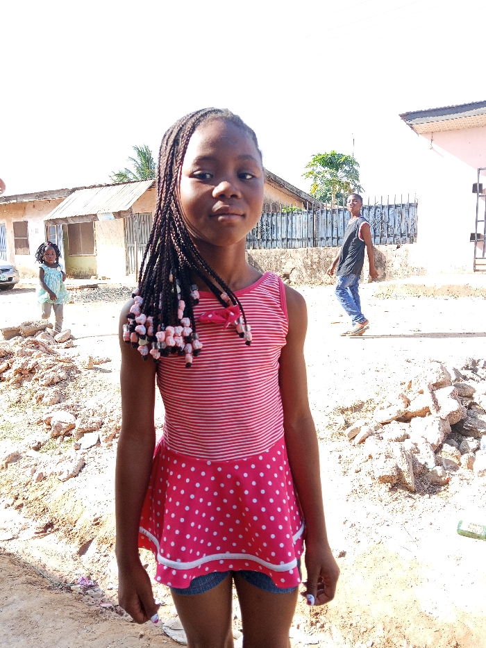 The image depicts an outdoor scene in Sabon Tasha, Nigeria, under clear, bright daylight. In the foreground, a young Black female, approximately 8-10 years old, stands centrally, facing the viewer with a neutral expression. She has long, dark braided hair adorned with numerous light pink and white beads on the ends of the braids, particularly visible over her left shoulder. She is wearing a sleeveless dress with a horizontally striped red and white bodice and a red skirt section with white polka dots, separated by a thin white trim. A red bow is attached to the left strap of her bodice. Below the dress, she wears denim shorts. Her fingernails appear painted light purple or white. In the mid-ground, to the far left, a younger Black child, possibly a girl, wearing a light blue or green patterned top, stands on a slightly elevated area of dirt and rocks, looking towards the main subject. Further to the right in the mid-ground, a Black male, approximately 20-30 years old, is walking from right to left. He wears a dark sleeveless shirt and blue jeans, with light-colored footwear. The ground consists of dry, light-colored dirt and numerous piles of broken concrete or rocks. In the background, on the left, there is a low, single-story building with a corrugated metal roof and off-white walls, featuring a dark-framed window and door. A light-colored vehicle is partially visible behind the child on the left. To the right of this building, a wooden fence or gate is visible, behind which a green tree is present. Further right, another building with a light-colored (possibly pinkish) exterior and a darker roof is partially visible. The sky is bright and clear.