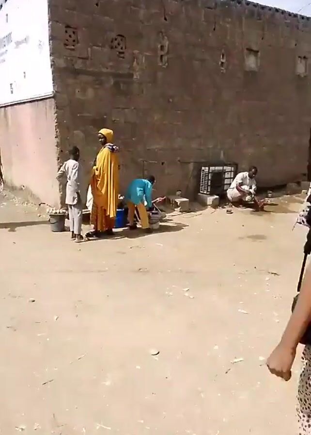 n outdoor scene in an arid area. Several people are visible. One individual in a long, yellow garment stands near others who appear to be washing or preparing something using buckets and a low table. Nearby, another person is seated on the ground and appears to be working. The camera moves, following a person in a long, patterned dress and a black headscarf. The scene shifts to a wider street view, showing people walking towards an entrance marked "FEDERAL UNIVERSITY DU". A car with its trunk open is parked to the side of the road.