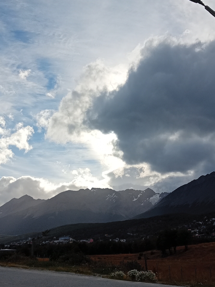 A picturesque landscape shows a range of mountains under a partly cloudy sky. The mountains are dark and rugged, with patches of snow on the peaks. The sky above is filled with a mix of fluffy white clouds and dark, ominous storm clouds. The sun appears to be shining through a gap in the clouds, creating a dramatic light effect. At the base of the mountains, a small town is nestled in a valley. In the foreground, a road runs along the bottom of the frame.