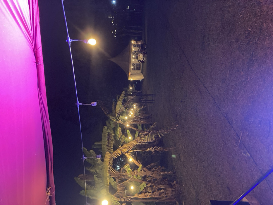 This image depicts an outdoor event space at night in Murera ward, Kenya. The scene is illuminated primarily by string lights featuring exposed, warm-toned bulbs, strung across a grassy area. A line of banana plants with visible dried foliage runs along the left side of the frame, also illuminated by the string lights. In the background, a white, conical tent stands erected on the grass, with tables and chairs visible inside, suggesting a gathering. A large magenta fabric canopy is partially visible across the top of the frame, casting a purplish light, particularly noticeable on a section of the string lights and the ground in the lower left. A dark cable or rope lies on the grass in the foreground. No individuals are visible in the scene.