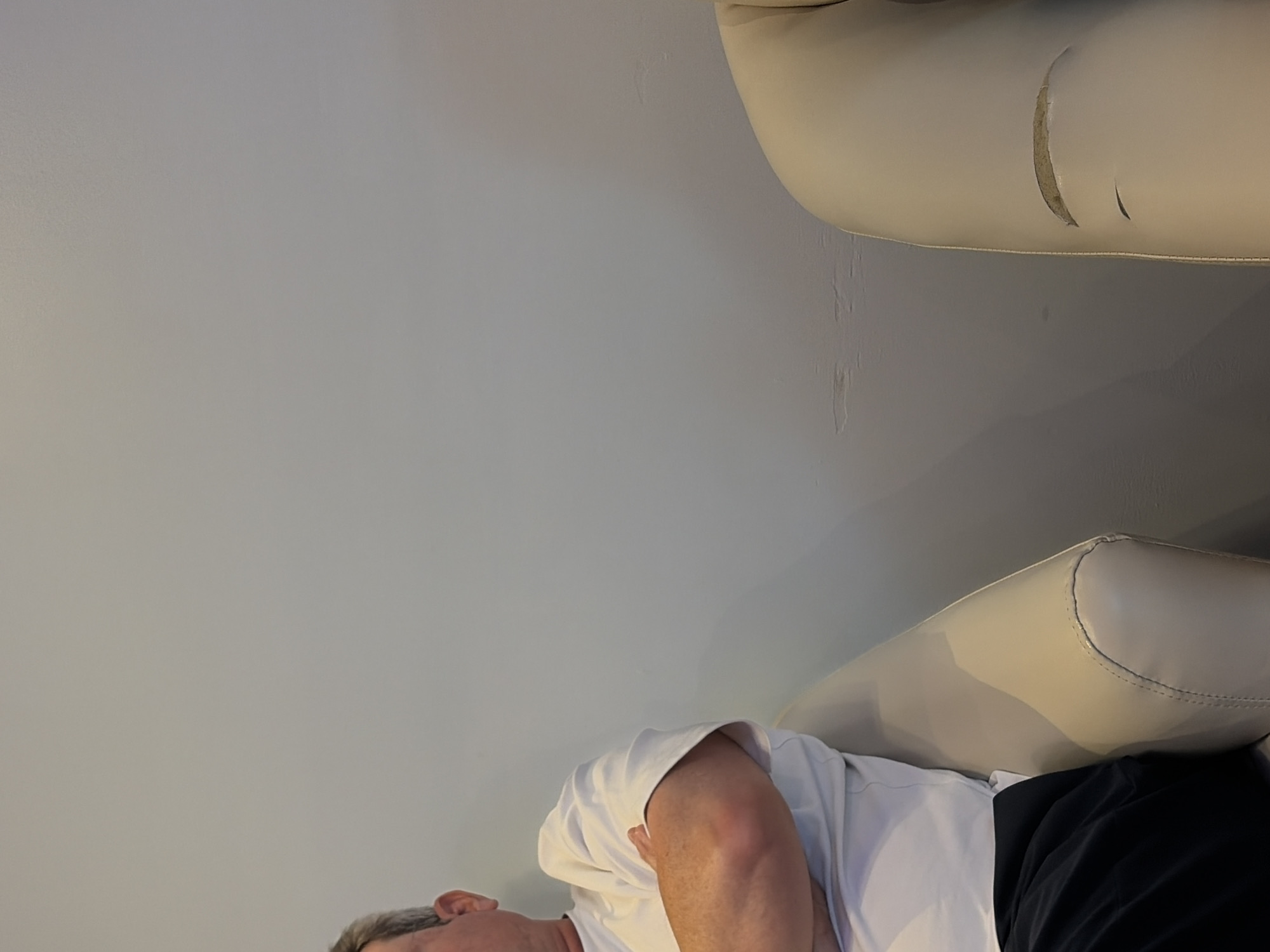 A man is laying on a white leather couch. The couch has a tear on the top corner. The man is wearing a white shirt and black pants. The background is a light gray wall. There is no evidence to suggest this image was taken in Huejotzingo, Mexico.
