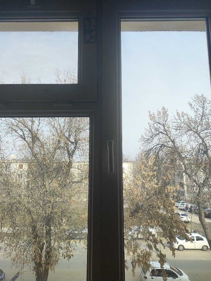 A window's gray frame divides the view into two panes. Bare trees dominate the landscape outside, their branches intricate against a pale sky. Buildings are visible behind the trees. Below, cars are parked along the street. The left pane shows a close view of the trees, while the right pane reveals more of the surrounding environment.