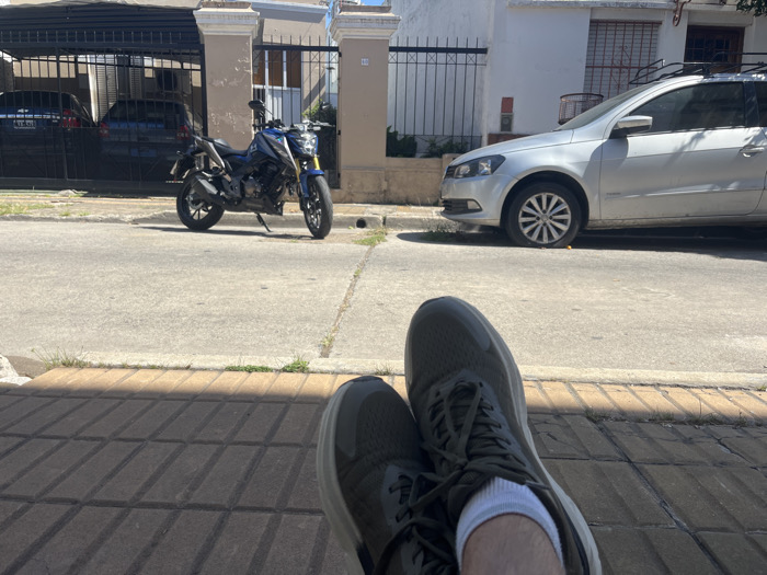 The image depicts an outdoor street scene in Bernal Este, Argentina, viewed from a low perspective. In the immediate foreground, a person's lower legs and feet, clad in dark grey athletic shoes with white socks, are visible, resting on a textured brown sidewalk composed of rectangular pavers. Strong sunlight casts parallel shadows across the sidewalk from the left. The midground features a light grey asphalt street. A blue and black motorcycle with gold-colored front forks is parked on a kickstand on the left side of the street, oriented towards the left. A silver compact SUV or hatchback, possibly a Volkswagen, is parked on the right side of the street, also facing left, with its front passenger tire appearing deflated. The vehicle has a black roof rack. In the background, on the left, a light tan residential building with a dark metal gate covering a carport is visible, housing two dark-colored automobiles. A light-colored pillar displays a partial house number, appearing to be "10XX". To the right, behind the silver car, is a white residential building with a dark metal security gate over a window. The sky is clear and blue, indicating a sunny day. Sparse green vegetation is present along the curb. No direct human interaction is depicted.