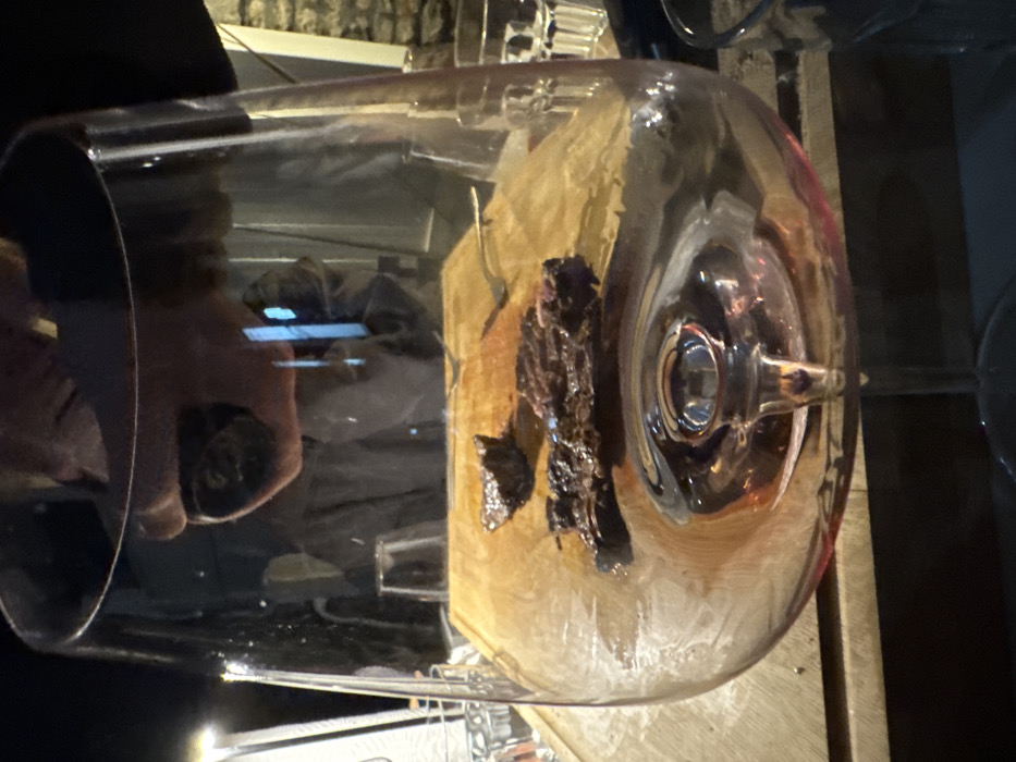 This image depicts a dining scene within a restaurant or bar in New York, United States. A large, clear, empty wine glass or decanter dominates the foreground, its bowl reflecting the partial face of an individual, presumably the photographer, and various ambient light sources. Through the transparent glass, a light-toned wooden cutting board is visible, resting on a darker wooden table. On the cutting board are several irregular pieces of cooked, dark meat, consistent with sliced steak, exhibiting a seared exterior and a reddish, medium-rare interior. A silver fork is positioned on the board to the right of the meat. In the background, a textured wall, possibly stone or brick, and additional clear drinking glasses on the table are discernible, contributing to the dimly lit, atmospheric environment.