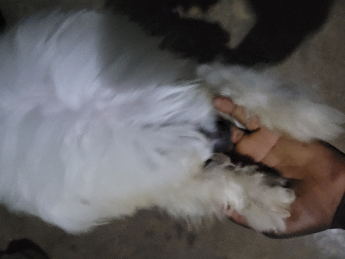 A fluffy, white dog is being held in a person's hand. The dog's fur is long and slightly matted. The person's hand is partially visible, appearing dark against the white fur. The background is blurred and unclear, showing a dimly lit surface. The overall image has a slightly grainy quality.