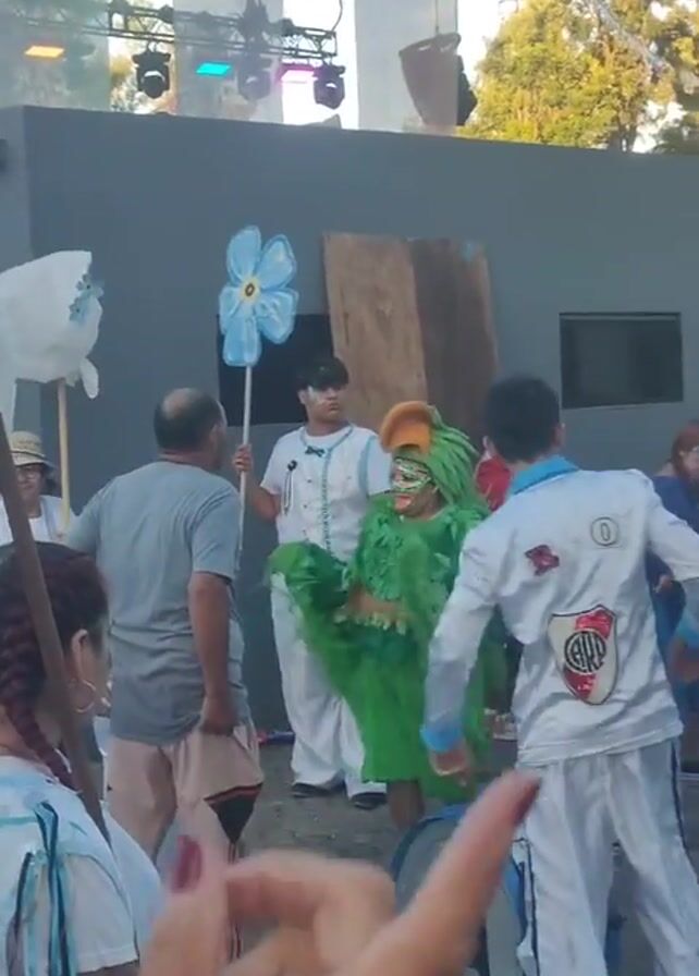 Here's a concise description of the video: The video captures a group of performers preparing to enter a stage area in front of a large crowd. The performers are dressed in brightly colored costumes including one in a green feathery suit with a large orange hat. Several people are carrying blue flower props and flags. At least one of the costumes appears to be related to the River Plate athletic club of Argentina. A large drum is visible near the group. The crowd is gathered in an outdoor space with trees visible in the background. Banners and stage lighting are present above the staging area.