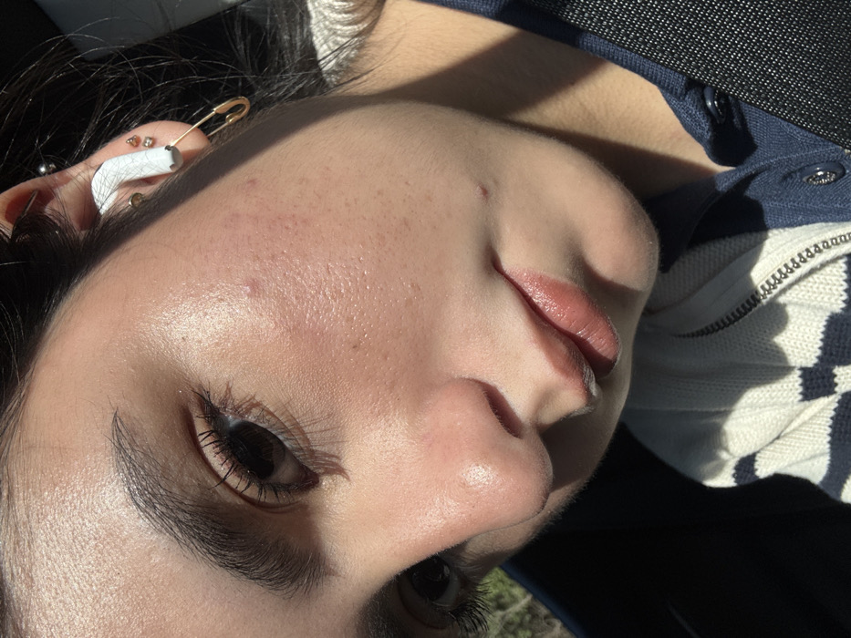A close-up, angled shot of a person's face captures their eye, nose, and lips. The skin has a slight sheen and some blemishes. A white earbud is visible in the ear, accessorized with a gold safety pin. Additional ear piercings adorn the ear. The person wears a dark-colored garment with visible buttons and a blue-and-white striped top underneath. Sunlight falls across the face, creating shadows that define the features.