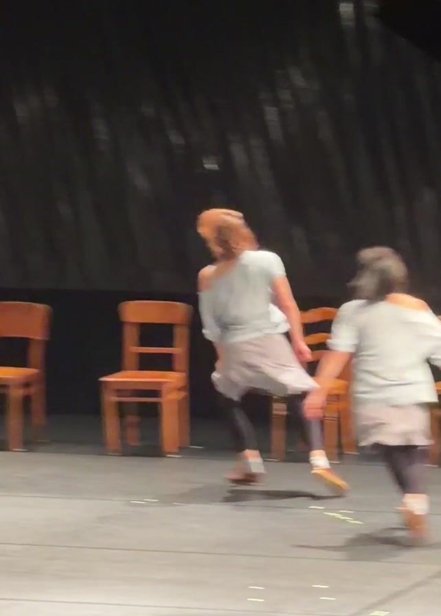 Two dancers, one with short blonde hair and one with dark hair, perform on a stage with a black backdrop. They are dressed in similar outfits: loose white tops, dark leggings, short grey skirts, and brown shoes. Three wooden chairs are arranged on the stage. The dancers move around the chairs, making wide arm movements and stepping with energy. One dancer briefly touches a chair. A lighting rig is visible on the right side of the frame.