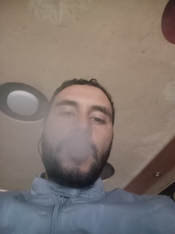 The image captures an adult male in an indoor setting in Ouislane, Morocco. The subject, seen from the chest up, possesses dark, curly hair and a full dark beard. He is directly facing the camera while exhaling a visible cloud of white vapor or smoke from his mouth. He is dressed in a light blue or gray jacket with a prominent zipper. An earbud wire is visible near his left ear. The background consists of a light-colored ceiling featuring a circular recessed light fixture on the upper left, with a partial dark red or brown element visible on the upper right.