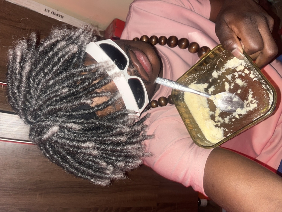 A person with gray dreadlocks and white sunglasses lies sideways on a wooden floor, wearing a pink shirt and brown beaded necklace. A clear, square dish containing a light-yellow substance and a spoon is near their face. The individual's dark skin is visible, and a hand holds the dish. A "RAPID A3" labeled item sits nearby.