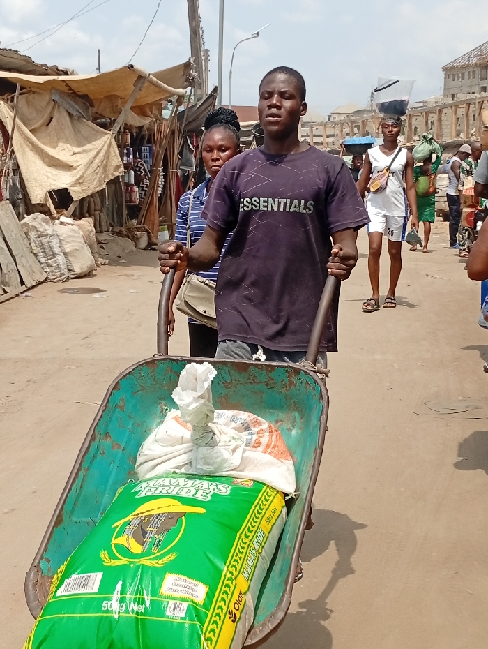 A man in a dark purple "Essentials" t-shirt pushes a teal wheelbarrow carrying a green "Mama's Pride" bag and a white sack. A woman in a blue and white striped shirt walks behind him. They are on a crowded street. Other people walk by, including one with a container balanced on her head. Stalls line the side of the street, and some buildings are visible in the background. The scene is captured in bright daylight.