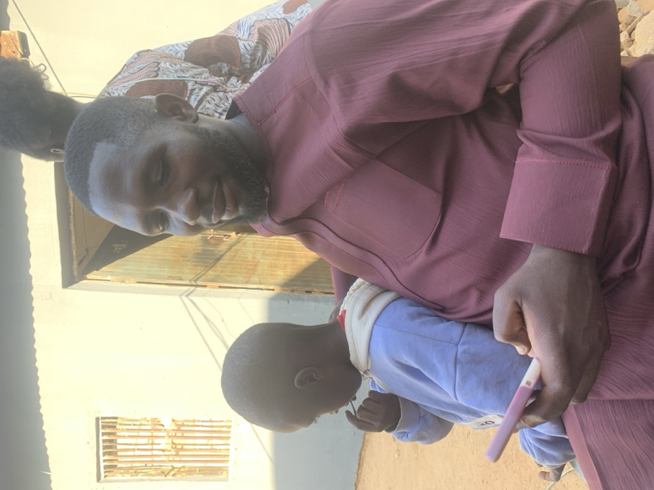 A man with a beard, wearing a maroon shirt, is holding a small child with a light blue sweatshirt. The child is looking down. The man is holding a pink object in his right hand. Behind them, a door or wall is visible. The background also includes what appears to be a building with a window. The overall scene appears to be outdoors during daylight.