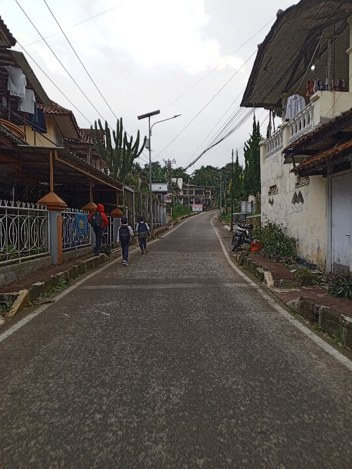 The image depicts a residential street winding uphill under an overcast sky. The dark grey asphalt road, with white lines marking its edges, recedes into the distance, curving slightly to the right. On the left side of the road, a concrete curb separates the street from a metal fence with ornate scrollwork. Behind the fence, several houses with prominent, steeply sloped terracotta-tiled roofs are visible. The closest house features an awning structure from which white shirts and blue jeans are hung to dry. Further back, large, multi-branched cacti grow alongside the buildings, and dense vegetation covers rising ground. A tall street lamp equipped with a solar panel stands further up the road, and numerous overhead power lines crisscross the sky from utility poles. On the right side of the road, a concrete curb, partially overgrown with small plants, borders an aged, light-colored building with a decorative balcony railing. White clothing items are hung on the balcony or from an overhang for drying. This building also has a steeply sloped roof with wide eaves. A dark-colored motorcycle is parked on the curb near this building. Conifer-like trees are visible behind the building and further along the road. Three individuals are walking away from the viewer, ascending the road. The leftmost person wears a red jacket and dark pants, carrying a dark backpack. The middle and rightmost individuals, likely students, wear dark tops, possibly light pants (middle), and dark pants (right), each carrying a backpack, resembling school uniforms. The architectural styles, presence of specific vegetation like large cacti and conifer-like trees, and the hilly terrain do not align with typical visual characteristics of Chennai, India; therefore, the location depicted cannot be confirmed as Chennai based on the visual evidence.