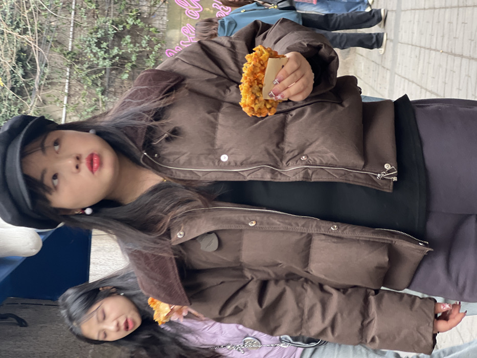 An Asian woman in a black beret and brown puffer jacket holds a fried snack