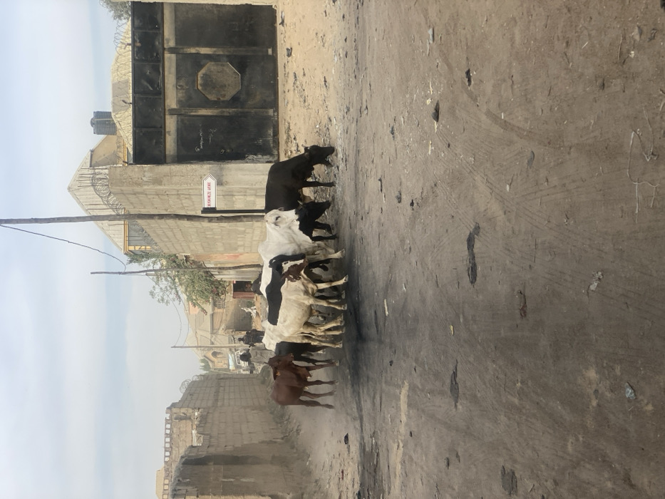 A herd of cattle moves along a dirt street between buildings. The cattle are mostly white with some brown and black. A tall metal gate is near the front of the herd. A sign points left, displaying "RESIDENCE AREA". A barbed wire fence tops a building. The sky is hazy.