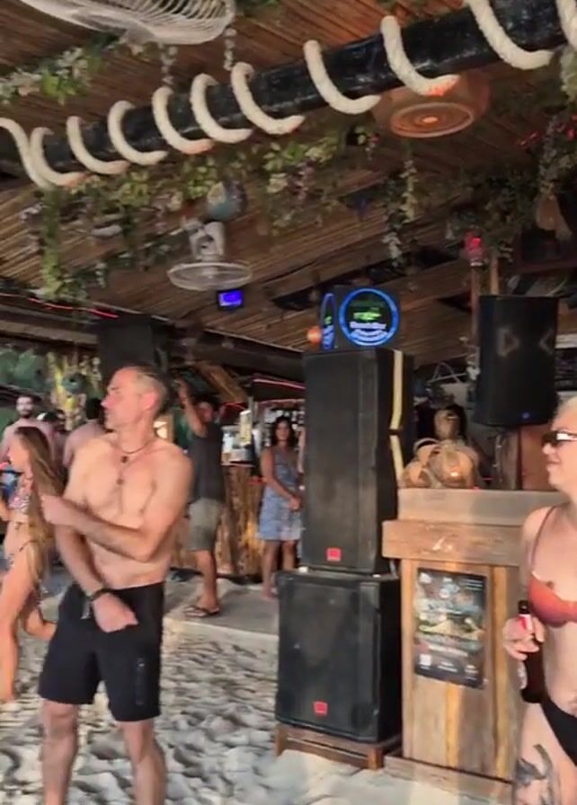 beach party at an open-air bar on a sunny day. People are dancing, drinking, and relaxing on the sand. The bar has a thatched roof decorated with lights and a disco ball. A woman with short blonde hair and tattoos is dancing in front of the bar, holding a beer. A man with red lipstick is dancing nearby. Some people are sitting in chairs looking out at the ocean. The water is calm and clear.