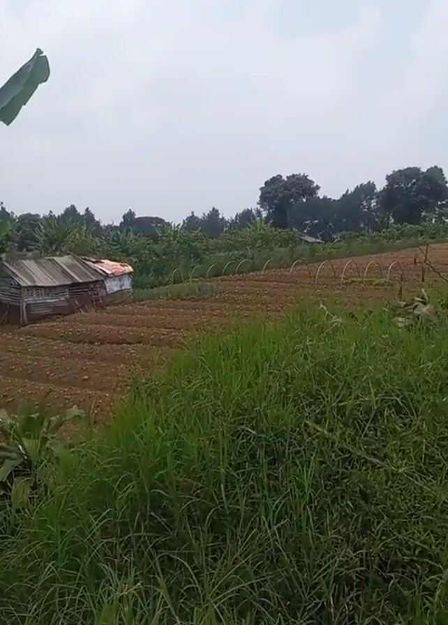 The video depicts a rural landscape under a slightly overcast sky. In the foreground, tall, green grass obscures the lower part of the view. Behind the grass, there is a tilled field with a reddish-brown soil. Arches are visible within the field, likely supporting structures for crops. To the left of the field, a small, weathered shack stands with a corrugated metal roof, part of which is red. Beyond the field, a line of trees forms a horizon under the cloudy sky. The camera appears to be static, providing a fixed view of the scene.