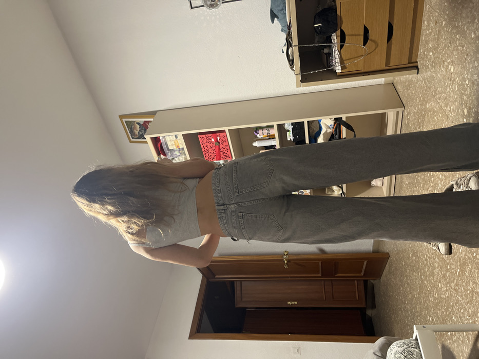 A person is depicted from behind, standing in an indoor residential setting. The individual wears a grey ribbed crop top that exposes the lower back and midriff, and light grey wide-leg jeans. Their long, light brown hair extends down their back. White sneakers are visible on their feet. The room has plain white walls and a light brown, speckled tile floor. To the left, a dark wooden doorframe leads to an open dark wooden door, revealing a darkened interior. A white rectangular object is affixed to the wall near the doorframe. Partially visible on the far left is the corner of a bed or furniture with a white and grey patterned fabric. To the right of the person, a tall, light-colored shelving unit is against the wall, containing various personal items across multiple shelves, including red decorative boxes, bottles, folded clothing, and footwear. Above this unit, a gold-framed picture depicting a stylized fish or marine life is hung. Further to the right, a wooden three-drawer dresser displays a black handbag with a silver chain strap and a silver chain necklace on its surface. A spherical, reflective object, possibly a decorative light, is partially visible on the far right. Overhead lighting illuminates the room. The specific location within Valencia, Spain, cannot be determined from these indoor details.
