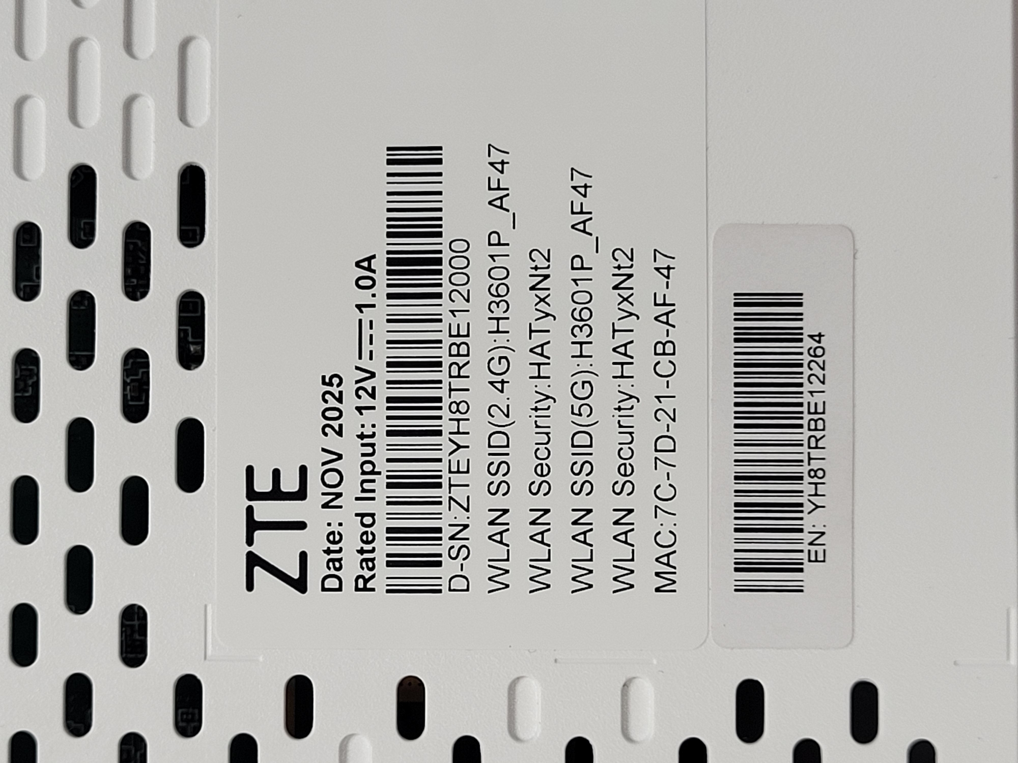 The image displays a close-up, top-down view of a white rectangular product label affixed to a white, perforated electronic device. The label features the brand "ZTE" in prominent black text at the top, followed by "Date: NOV 2025" and "Rated Input: 12V === 1.0A". Below this, a black linear barcode is present, identifying the serial number "D-SN:ZTEYH8TRBE12000". Further details include "WLAN SSID(2.4G):H3601P_AF47", "WLAN Security:HATyxNt2", "WLAN SSID(5G):H3601P_AF47", "WLAN Security:HATyxNt2", and "MAC:7C-7D-21-CB-AF-47". A second, shorter black linear barcode is visible near the bottom of the label, corresponding to "EN: YH8TRBE12264". The background of the label itself is white. The underlying electronic device is white with a pattern of horizontally elongated, oval-shaped perforations, consistent with a ventilation grille. These perforations are dark internally, suggesting depth. No people, discernible actions, or interactions are visible. The scene is an inanimate object in a close-up setting. The specific city location in the United States of America is not discernible from the image.