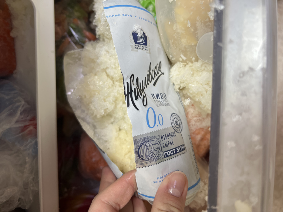 A close-up view depicts a human right hand holding a ruptured package of non-alcoholic beer inside a freezer compartment in Ust-Ilimsk, Russia