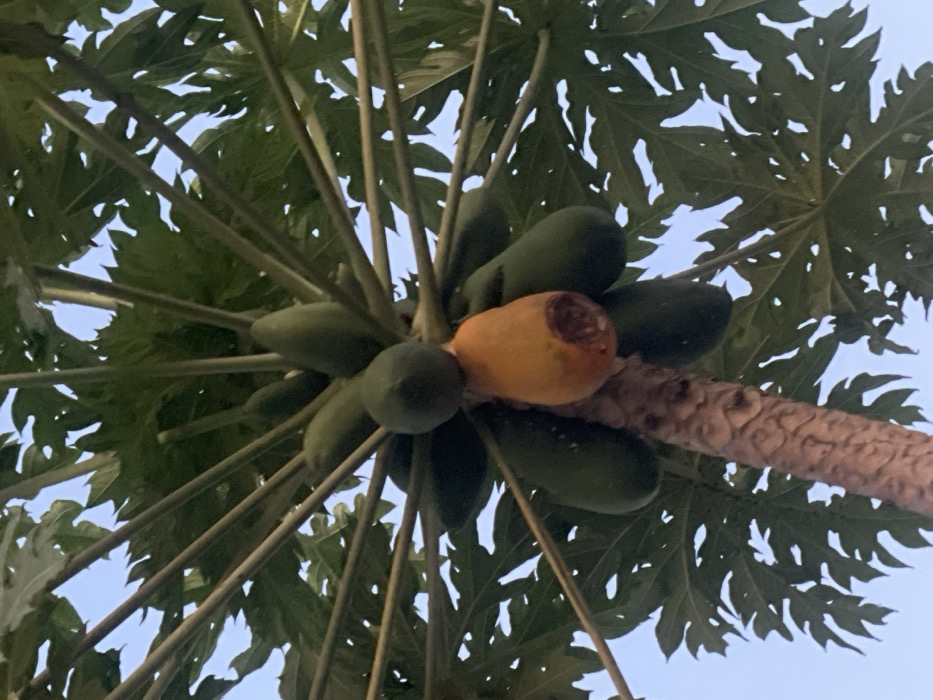 - "A low-angle view captures the crown of a papaya tree in Kumbang, Indonesia, against a clear light blue sky" by FM-56aBo1, licensed under CC BY 4.0