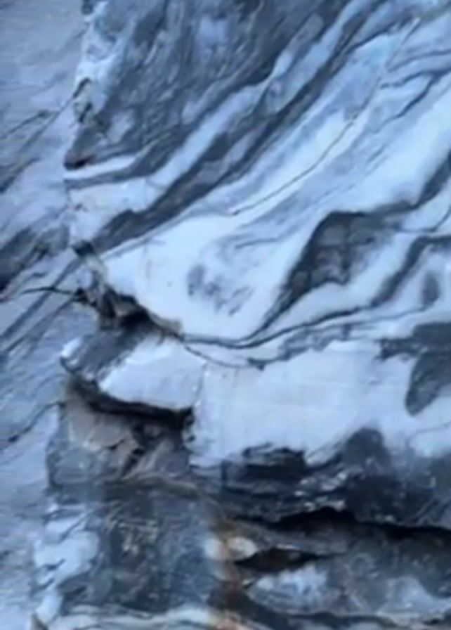 close-up view of a large rock formation with swirling patterns of gray and white stone