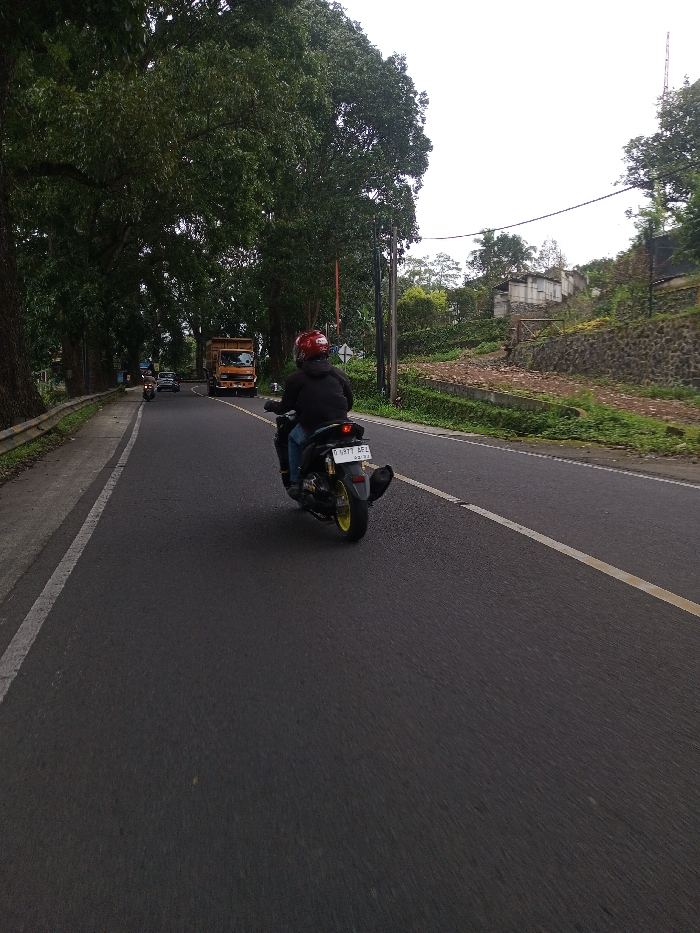 The scene depicts a road in Kodarapalli, India, under an overcast sky. A single individual wearing a red helmet, dark hoodie, and blue jeans is operating a black scooter, viewed from a rear-left perspective, traveling away from the camera. The scooter has yellow accents on its rear wheel rim, and its license plate reads "D 6977 BEZ" with "02.23" printed below. The road is asphalt, marked with a solid white line on the left shoulder and a broken yellow line in the center. To the left, a metal guardrail runs alongside the road, backed by a dense line of large, leafy trees forming a partial canopy. Further down the road, a tan-colored truck and other vehicles are visible. To the right, a grassy verge leads to a stone retaining wall. Beyond the wall, a hillside rises with scattered vegetation and multiple small, light-colored structures. Utility poles with overhead lines are present on the right side of the road.