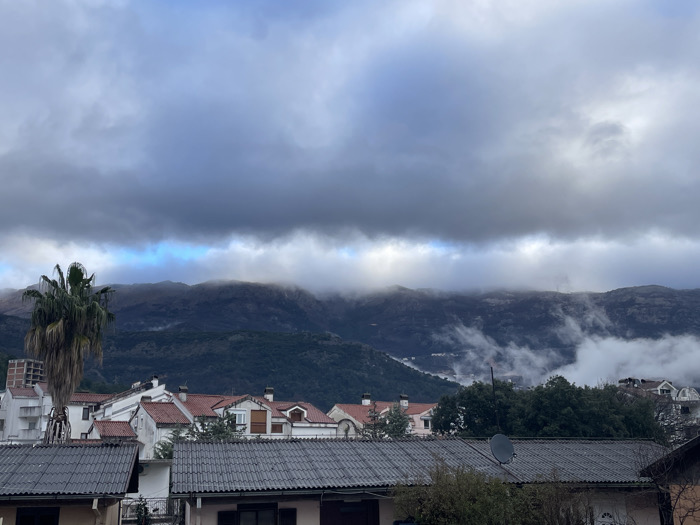A landscape of rooftops with reddish-orange tiles dominates the lower portion of the frame, transitioning into a forested mountain range obscured by a thick layer of low-lying clouds