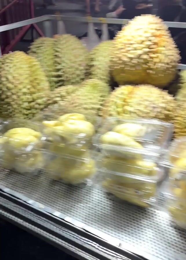 night market scene. In the foreground, a metal cart displays several whole durians alongside plastic containers of cut durian. A man sits near the cart. The camera follows the flow of people walking along a path lined with vendor stalls. Some people are standing near red tables and chairs. The market is illuminated by streetlights and the lights of the various stalls. Trees are visible against the night sky. In the distance are tall buildings.
