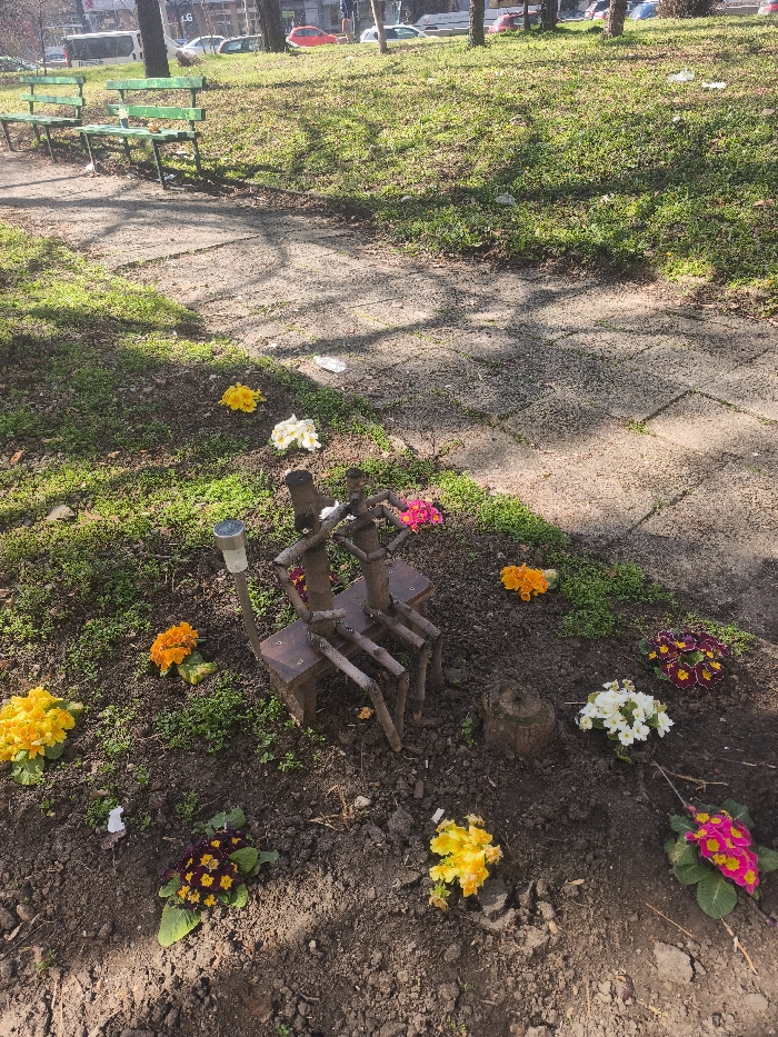 The image depicts an outdoor scene within a public park in Sofia, Bulgaria. In the foreground, two anthropomorphic figures crafted from dark, gnarled tree branches are seated on a small, dark wooden bench, positioned directly in dark brown soil. The figure on the left is taller and has a small white object at the head position; a metallic solar-powered garden light stands behind and to its left. The figure on the right holds a cluster of bright pink and yellow flowers. Surrounding these figures and a small weathered tree stump, numerous clusters of vibrant primrose flowers are planted in the soil, featuring colors such as yellow, white, orange, deep red/purple, and fuchsia. The ground immediately surrounding the installation is dark brown soil with sparse green vegetation. Further back, a light-grey paved path, composed of rectangular tiles, winds through an area of patchy green grass and scattered dry leaves. Two empty green wooden park benches are visible adjacent to this path. Beyond the benches, a line of trees with sparse foliage stands on a slight incline. Through these trees, an urban street is visible with several parked and moving vehicles, including a white bus and multiple cars, some red, indicating a city environment. Distant buildings are discernible on the horizon. The scene is brightly illuminated by direct sunlight, casting distinct shadows from the trees and the twig figures. Minor white litter is scattered on the grass and near the paved path. No living individuals are present in the immediate vicinity.